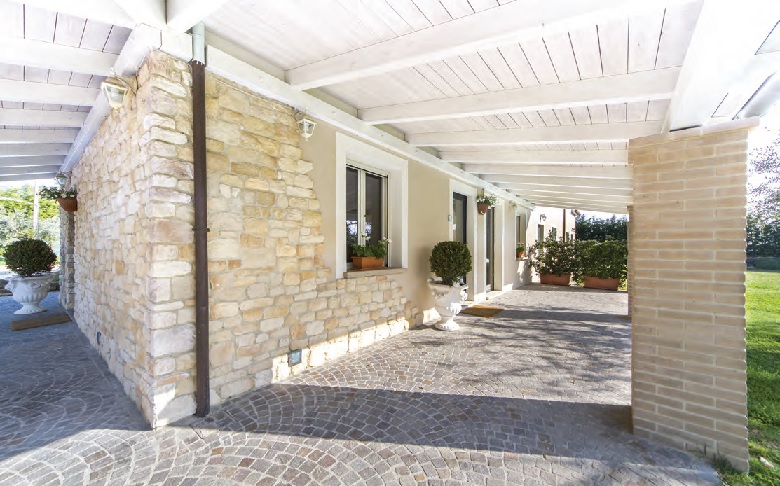 Porticato in abete lamellare e perlinato sbiancati. Pavimentazione con cubetti di porfido, rivestimento con Kerma Biopietra