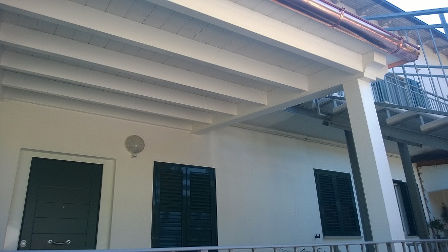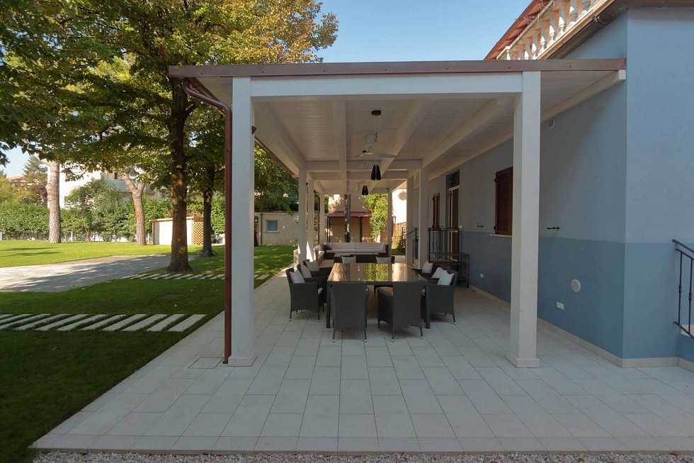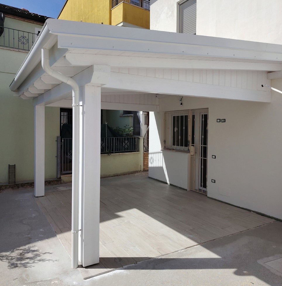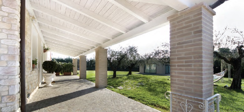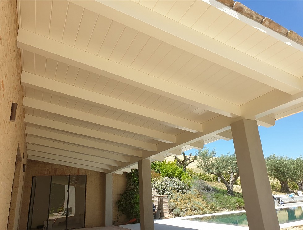 Porticato con travi lamellari e tavolato in abete colore bianco. Copertura con coppi in laterizio.