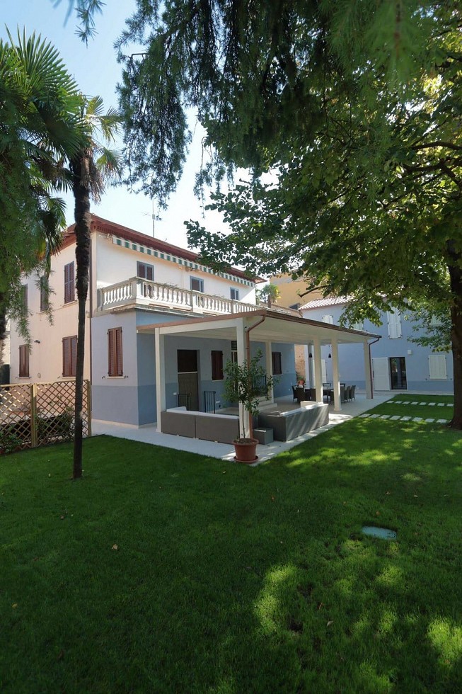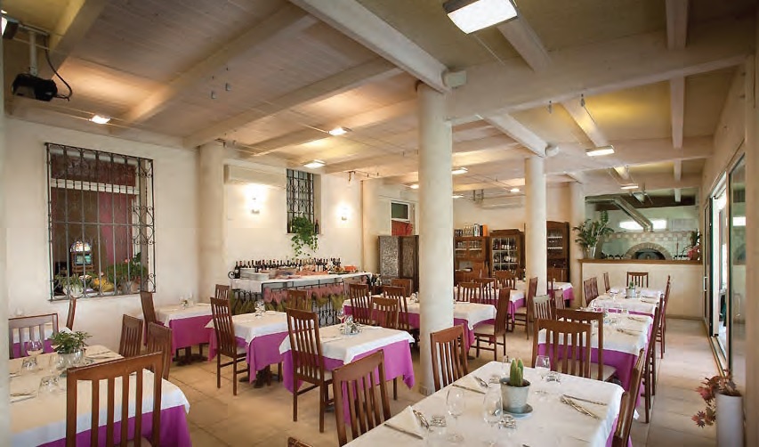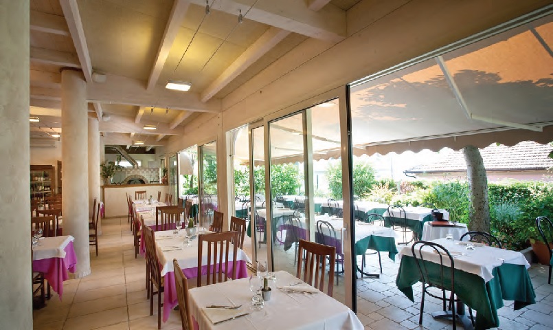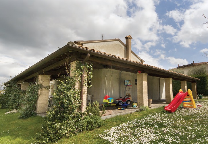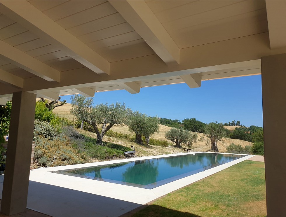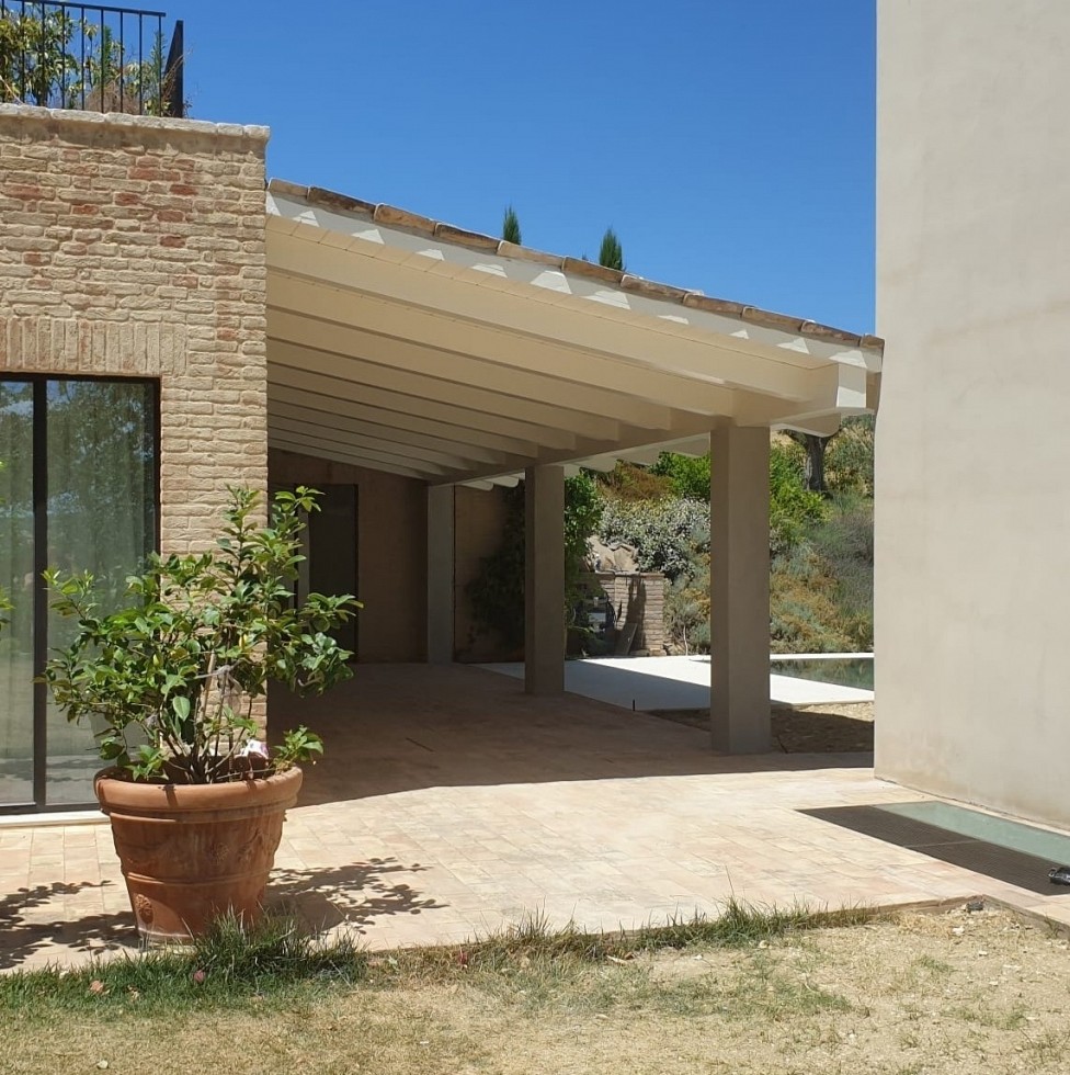 Porticato con travi lamellari e tavolato in abete colore bianco. Copertura con coppi in laterizio.