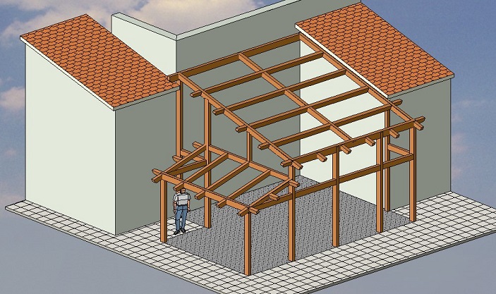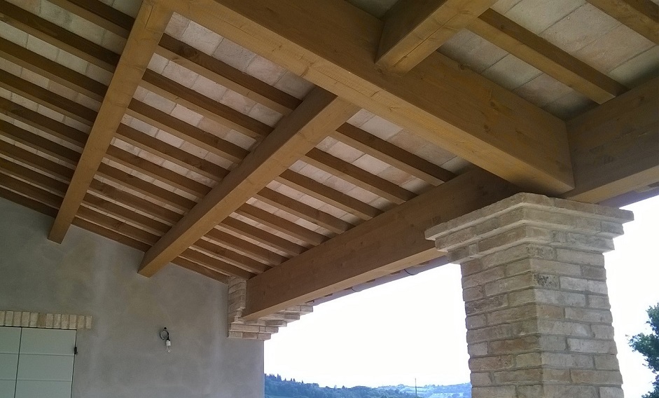 Porticato in abete lamellare, morali in abete e pianelle in cotto