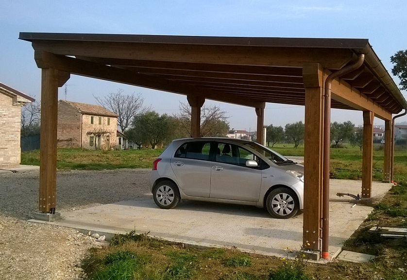 Carport in abete lamellare con copertura di tavolato in abete e tegola tipo canadese