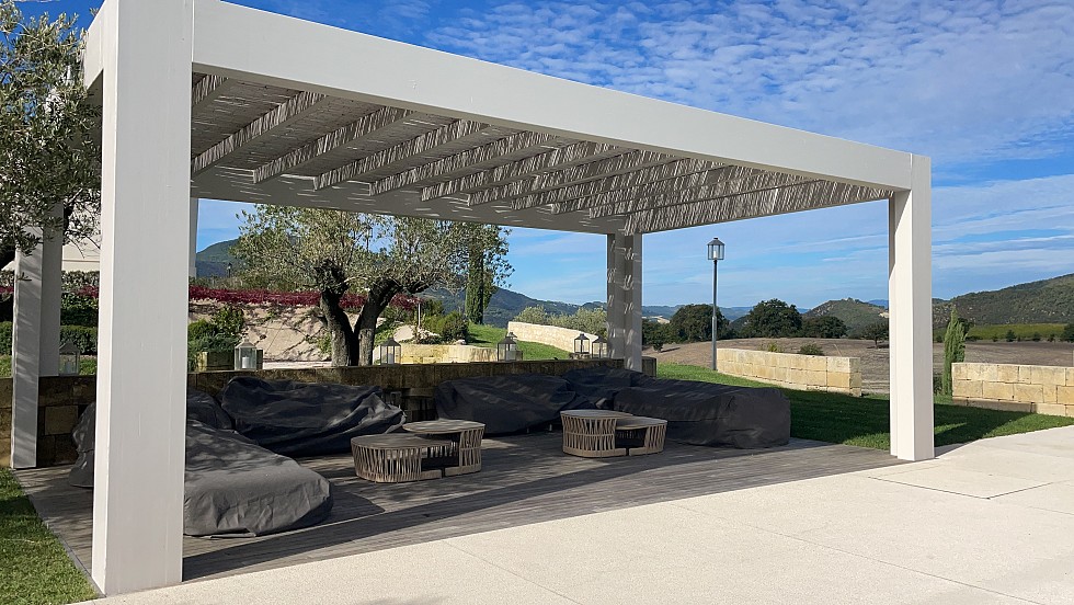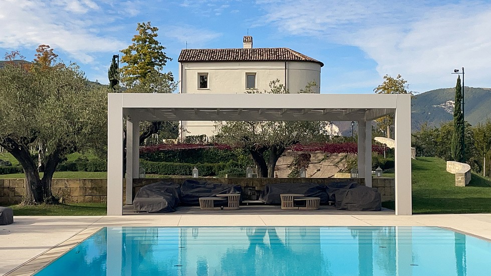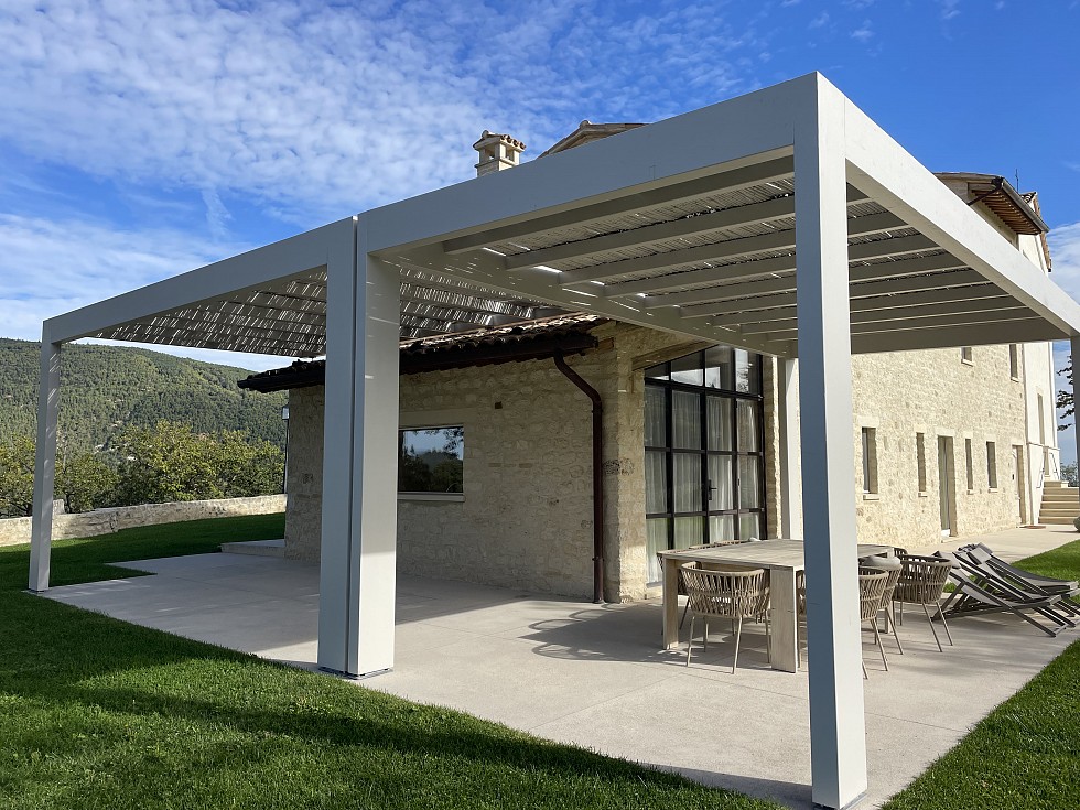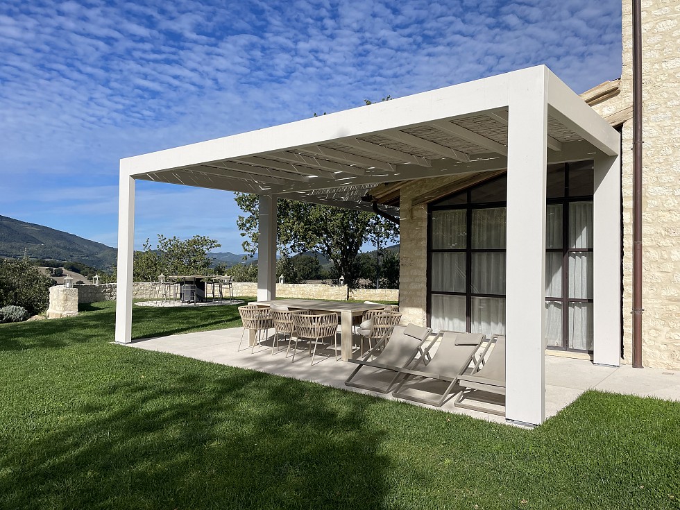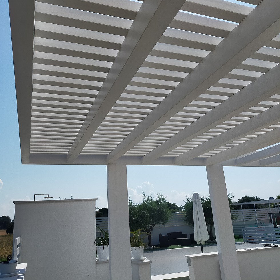 Pergolato in abete lamellare laccato con smalto ad acqua. Copertura frangisole con cannucciato di bambù