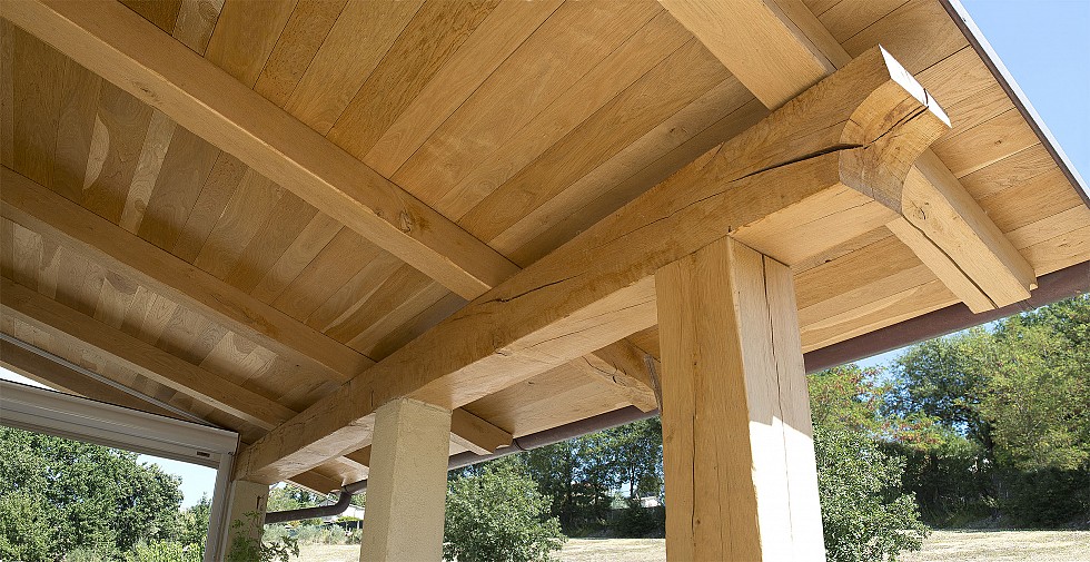 Porticato con colonne in mattoni anticati e copertura con travi in rovere uso fiume