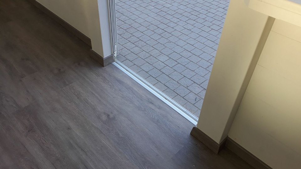 Lavoro eseguito presso Jesi (AN). Struttura in legno di abete lamellare sbiancato. Infissi in alluminio con chiusure in telo pvc cristallo a scorrimento verticale. Pavimento in laminato LVT su struttura con telaio di profili in alluminio e pannelli di multistrato marino.