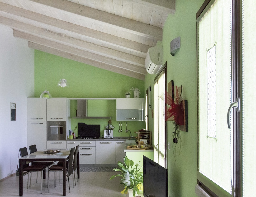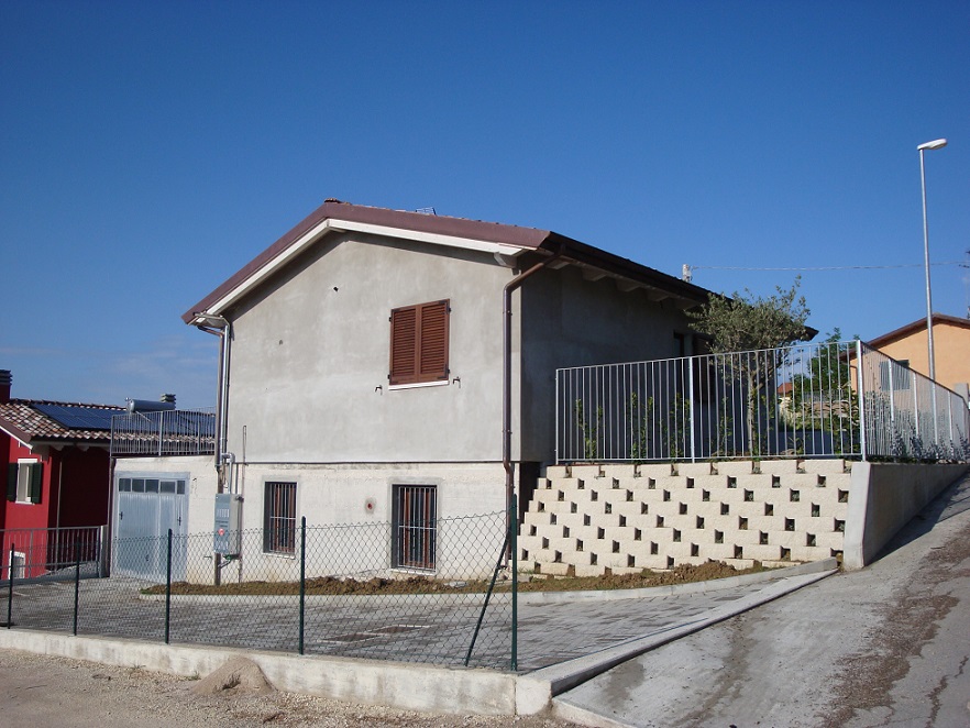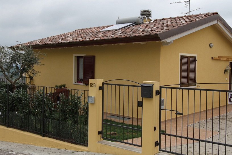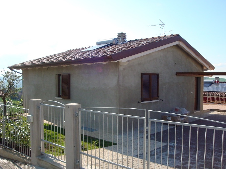 Casa in bioedilizia di mq.110: struttura portante con pannelli X-LAM , copertura con travi lamellari e tavolato abete con sistema tetto-ventilato. Isolamento esterno con sistema cappotto a pannelli di sughero e intonachino traspirante naturale. La casa si trova in un piccolo borgo immerso nella bellezza delle colline marchigiane.
