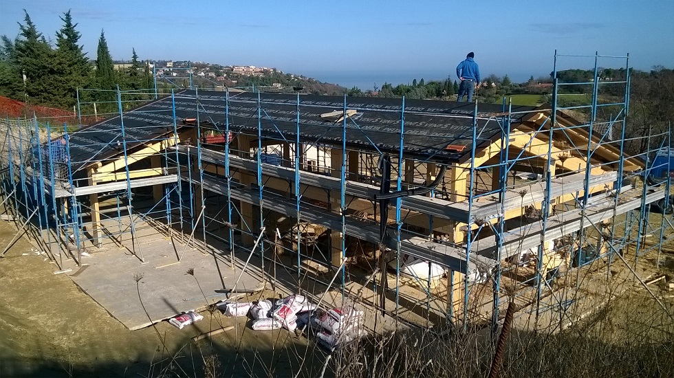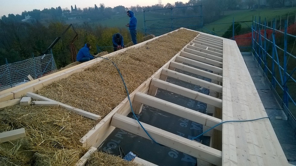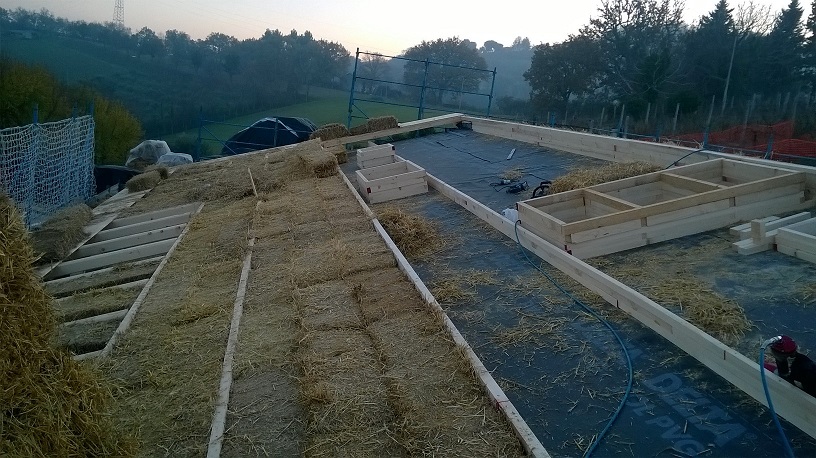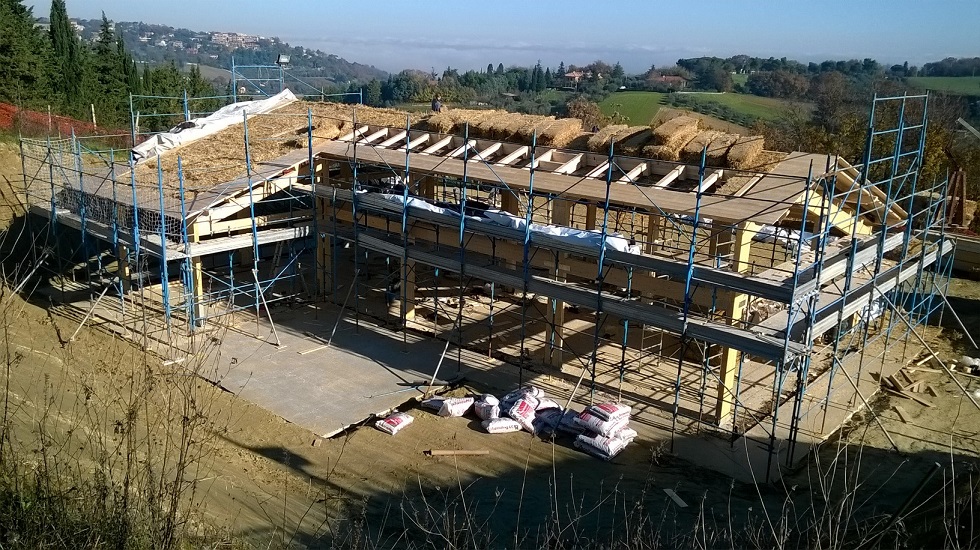 Casa in legno con isolamento a parete e copertura con ballette di paglia. Un sistema costruttivo antico riproposto in chiave moderna, per una edilizia ecosostenibile volta alla realizzazione di un ambiente sano, confortevole e in armonia con la natura. La casa si trova nelle colline intorno a Fano, con una bella veduta sul mare Adriatico.
