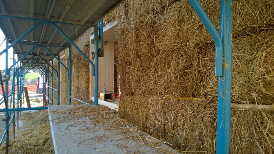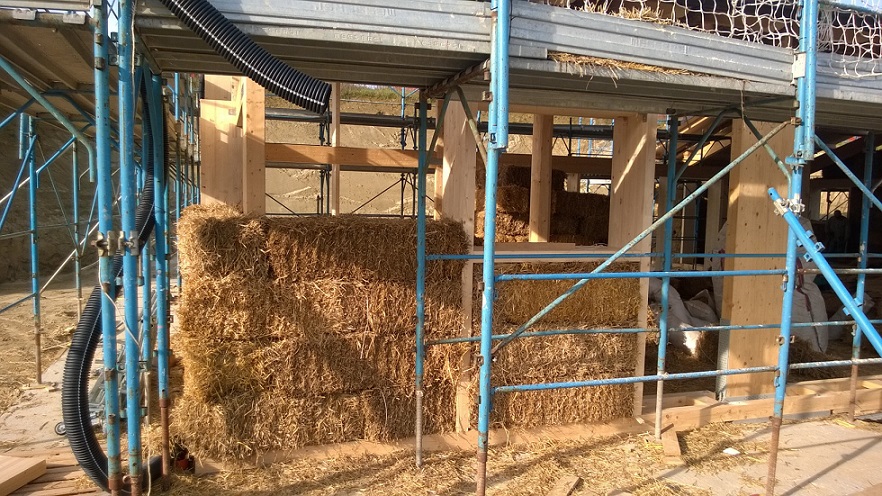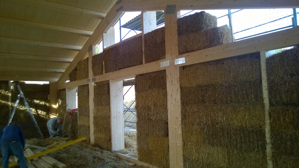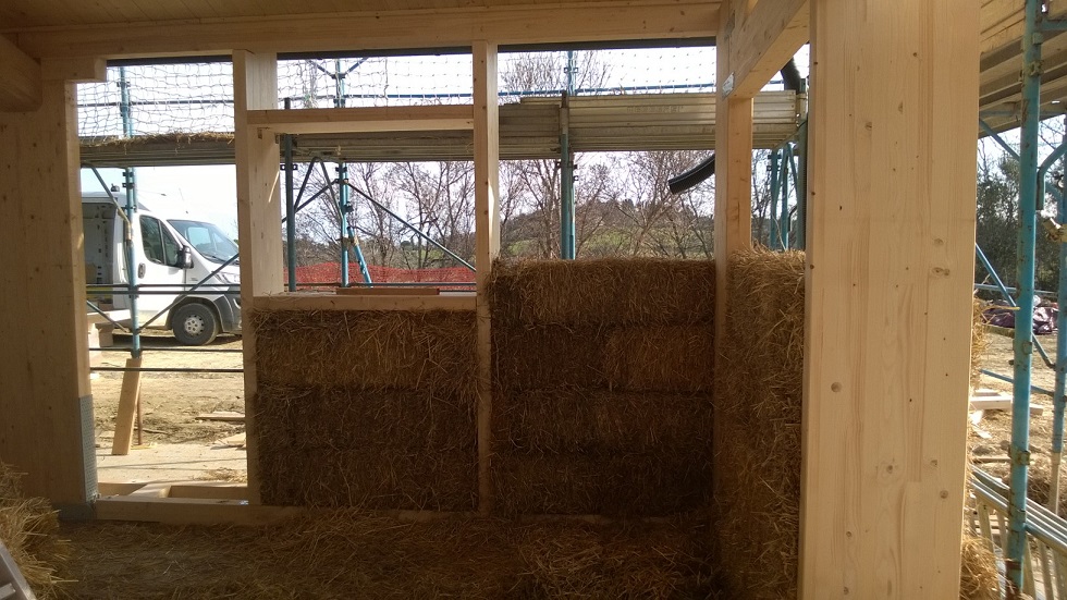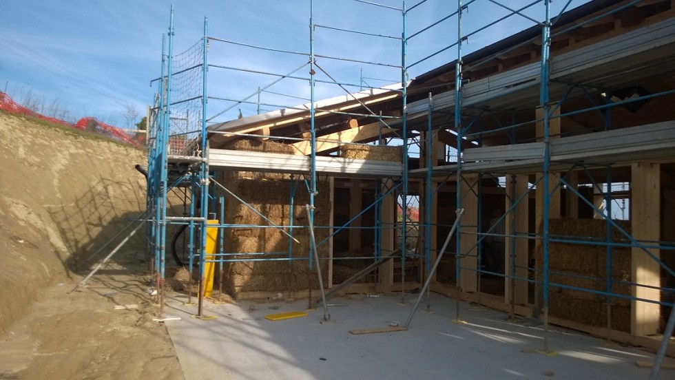 Caratteristiche distintive: edificio di mq.180 in classe energetica A , costruito con telaio portante in abete lamellare, travi di copertura in abete uso fiume e tavolato in abete, isolamento in copertura e a parete (tamponamento) con ballette di paglia, intonacate internamente con malta a base di terracruda ed esternamente con calce.