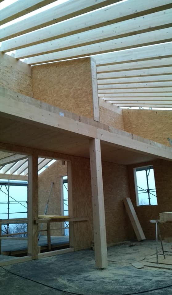Abitazione in legno con struttura portante costituita da pannelli di abete modello PLATFORM-FRAME. Solai e tetto con pannelli in abete portante.