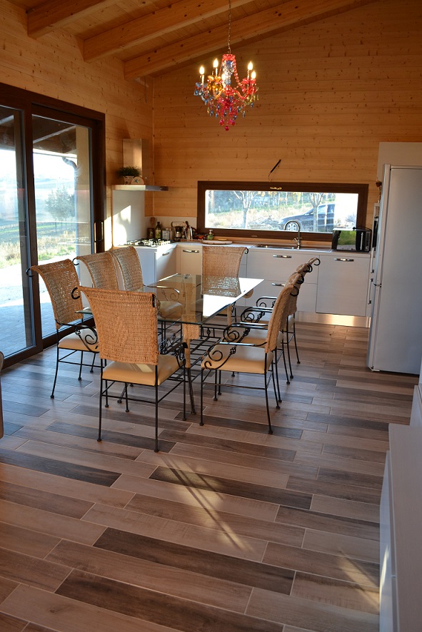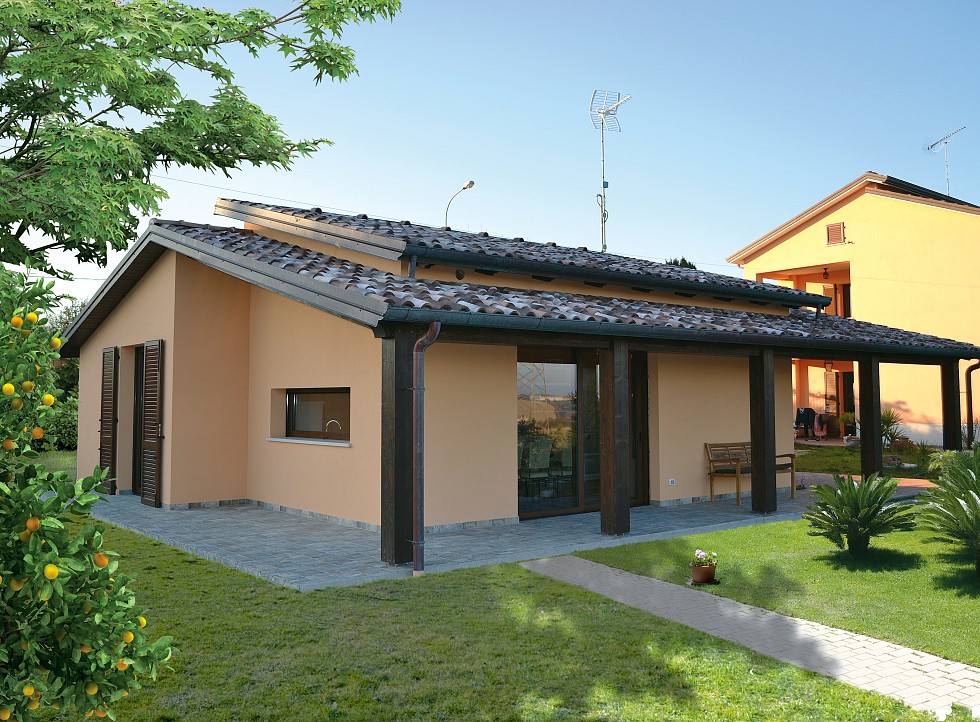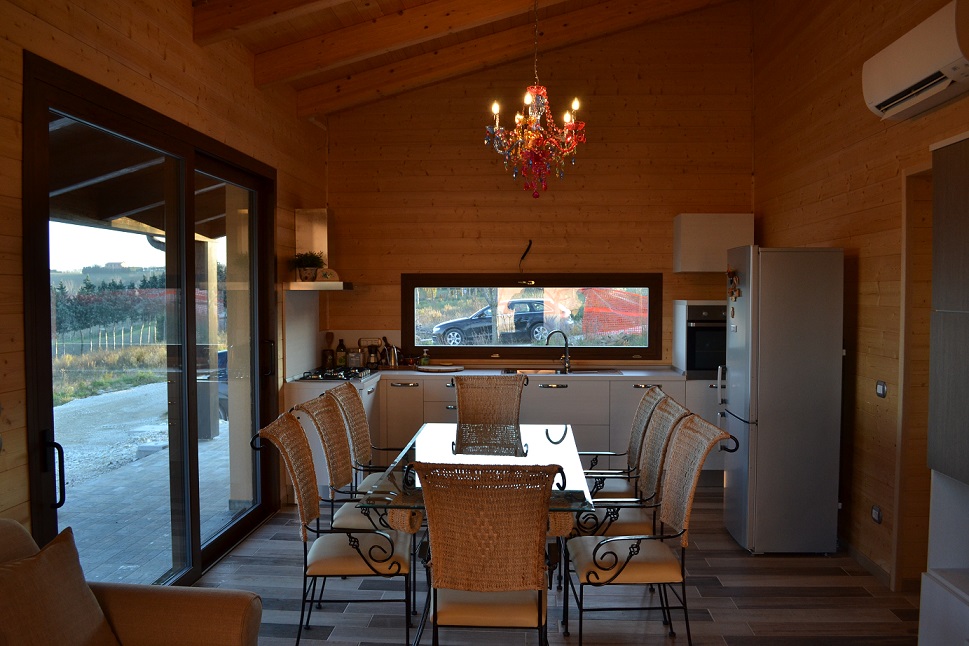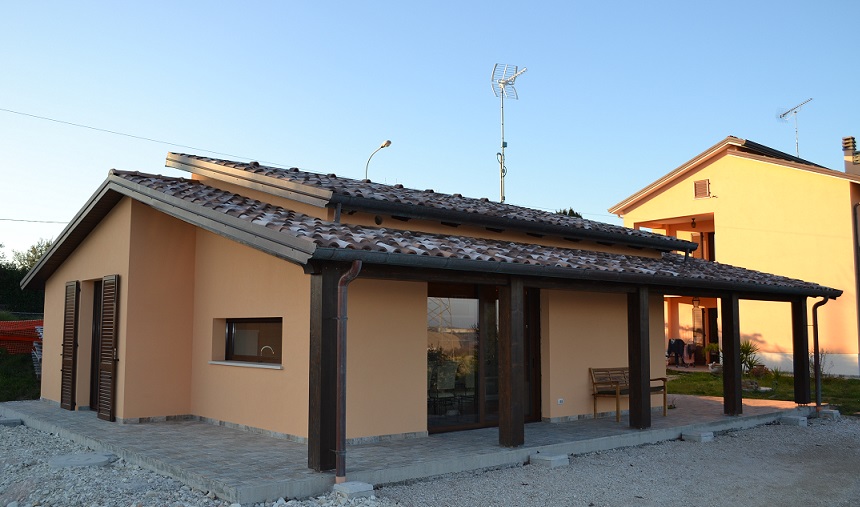 Casa in legno di mq.90 in classe energetica A. Struttura portante con pannelli X-lam. Isolamento esterno con pannelli in lana di roccia alta densità. Copertura con travi lamellari e tavolato abete con sistema tetto-ventilato. La casa è immersa nella bellezza e tranquillità delle colline marchigiane.