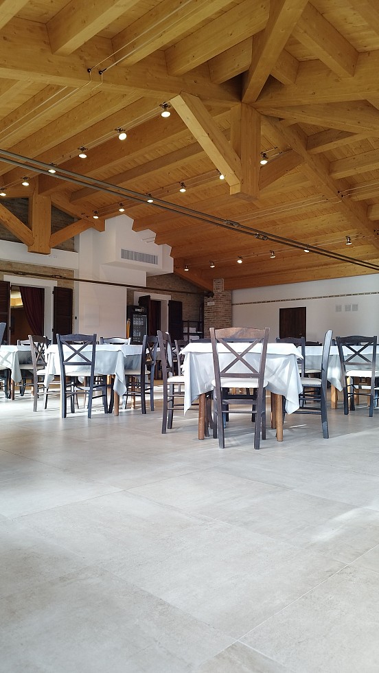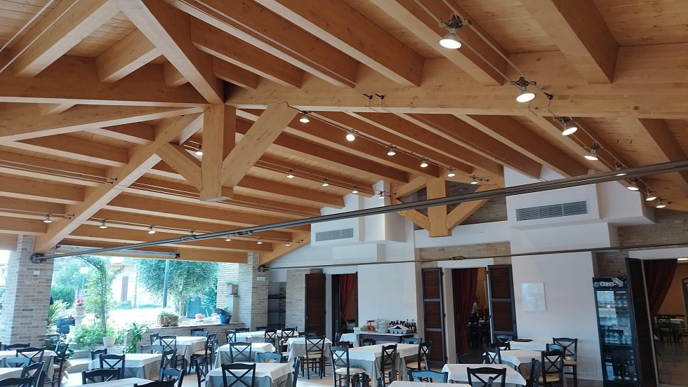 Ristorante il Castagno - Orciano : copertura in legno che permette al ristorante di usufruire di un'ampia e luminosa sala di mq.300 senza nessun pilastro centrale.