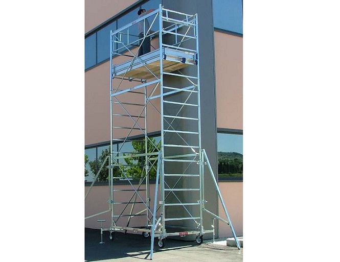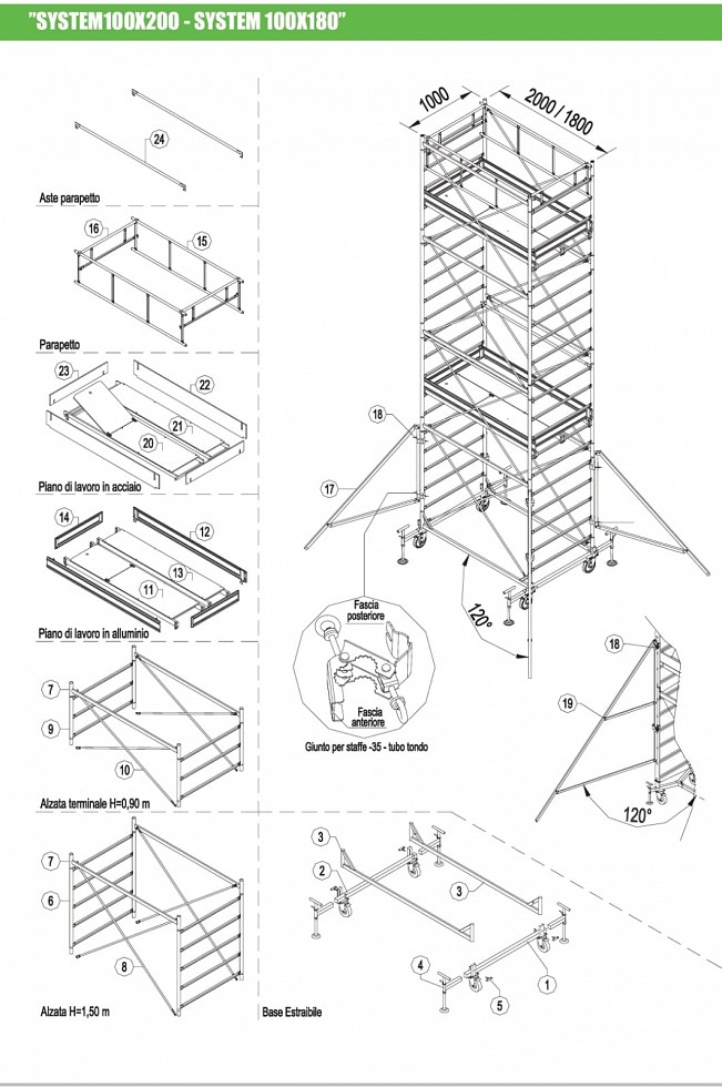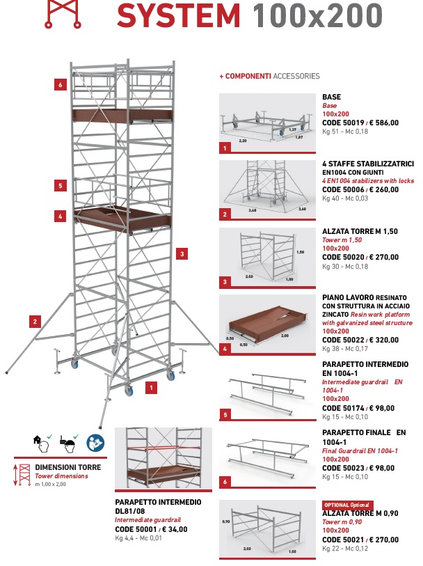 Composizione: 1 base (art.20575) +4 staffe stabilizzatrici (art.20753) +6 alzate torre H150 (art.20587) +2 piani di lavoro (art.21078) +1 parapetto (art.20746) +2 aste parapetto (art.20188)