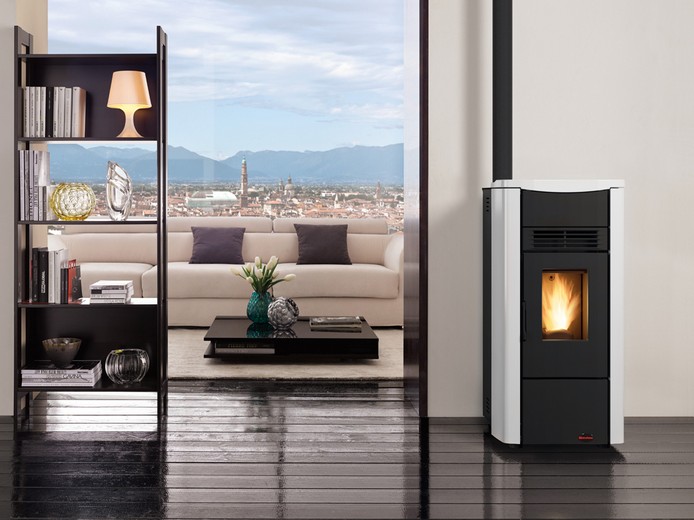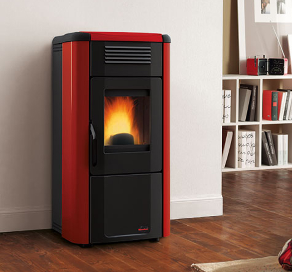 STUFA A PELLET EXTRAFLAME KETTY: rivestimento in acciaio verniciato, focolare in ghisa, termostato interno e di sicurezza, programmatore settimanale. Dimensioni: cm.46x51x89H. Potenza utile: kW 2,8/7,3